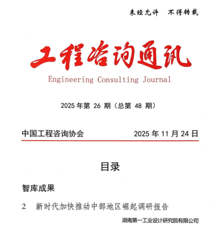 近日,湖南第一工業設計研究院有限公司(下稱 “我院”)牽頭完成的工程咨詢行業智庫聯盟 2024 年度課題成果《新時代加快推動中部地區崛起調研報告》(課題編號:2024-F01),正式刊發于中國工程咨詢協會核心內部刊物《工程咨詢通訊》2025 年第 26 期(總第 48 期)“智庫成果” 欄目。